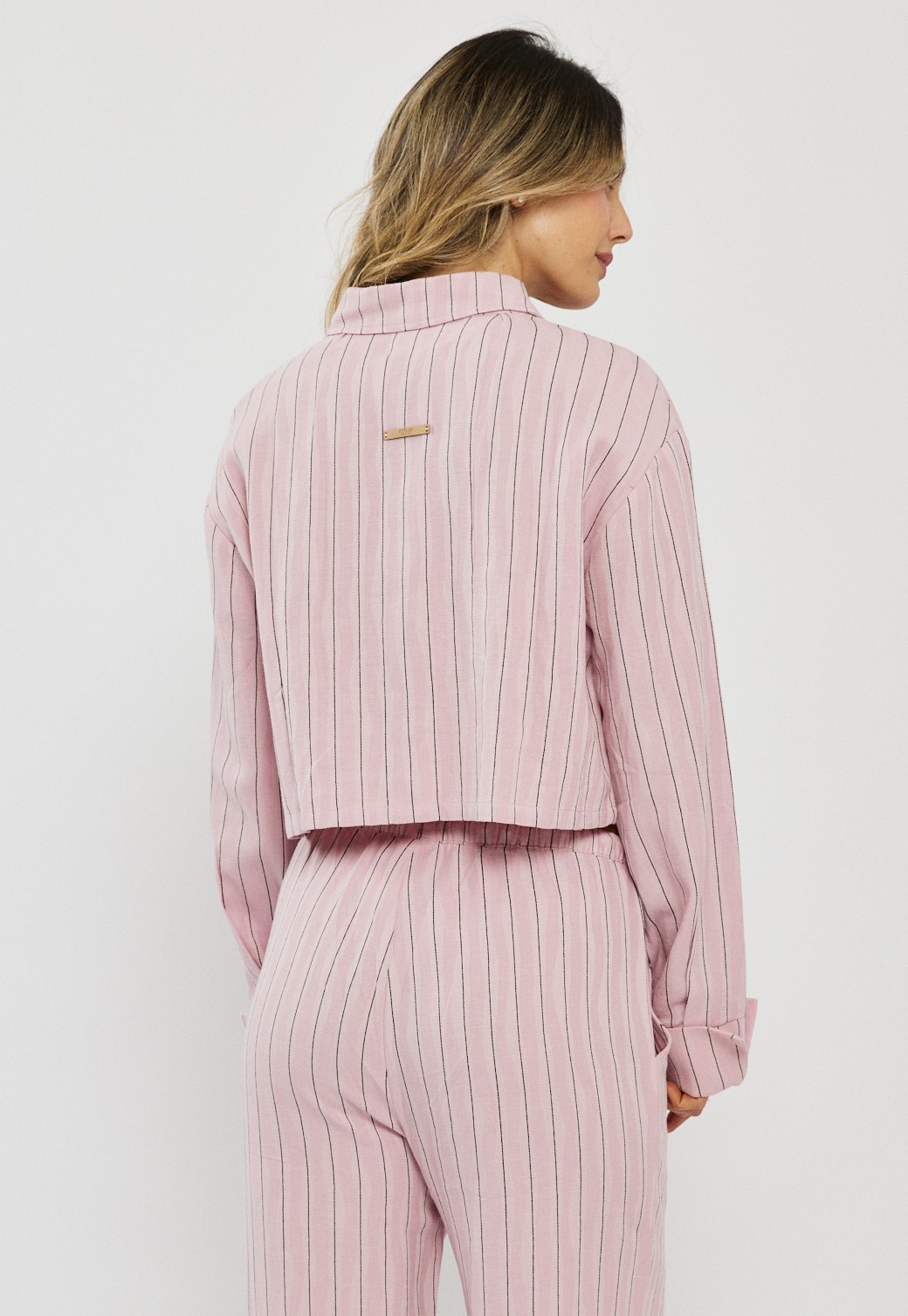 חולצה מכופתרת בגזרת קרופ בגוון ורוד פודרה עם פסי אורך עדינים ומחמיאים.