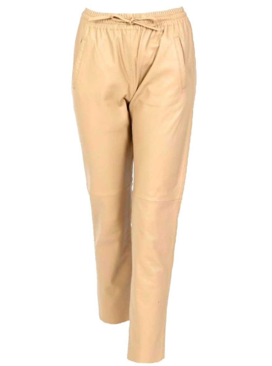מקט : 2350631א מכנס עור נפה בצבע קמל .של מותג צרפתי. מותן בסיומת גומי. שרוול מכנס סקיני משוחרר.