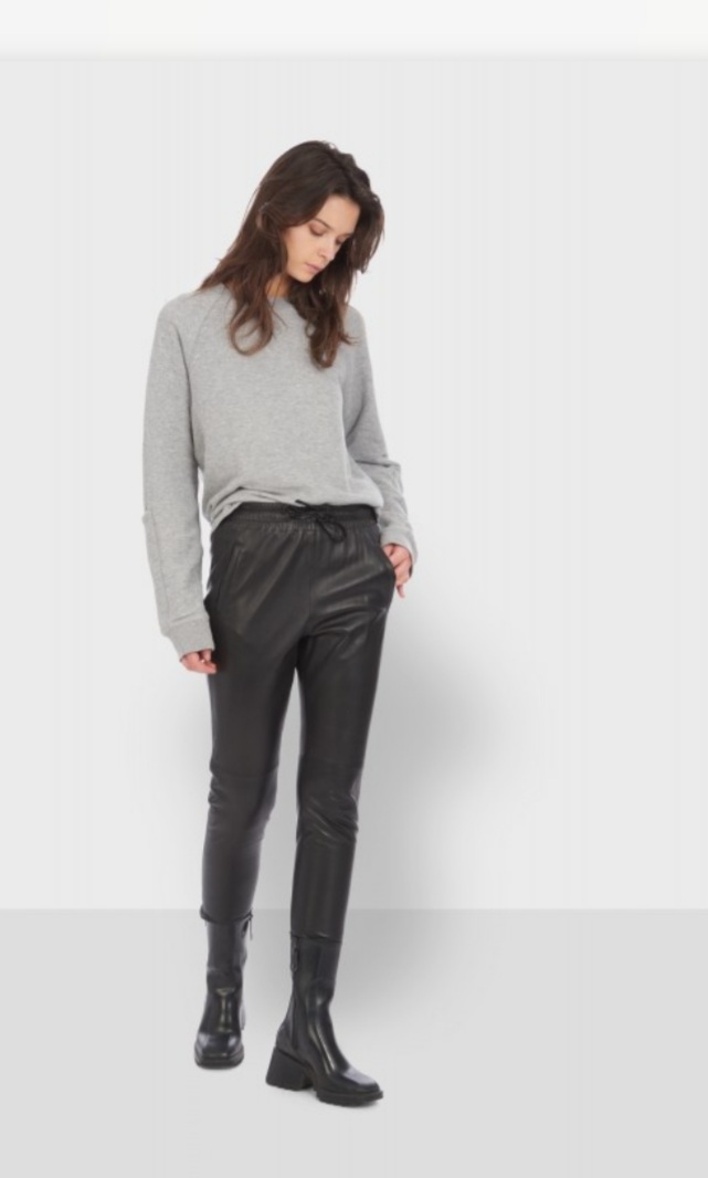 מקט : 2350631 מכנס עור נפה בצבע שחור .סיומת גומי במותן וסרוך. שרוול המכנס בגזרת סקיני רחב. גזרה לקוחה מעולם הספורט. המכנס של המותג הצרפתי OAKWOOD/ N
