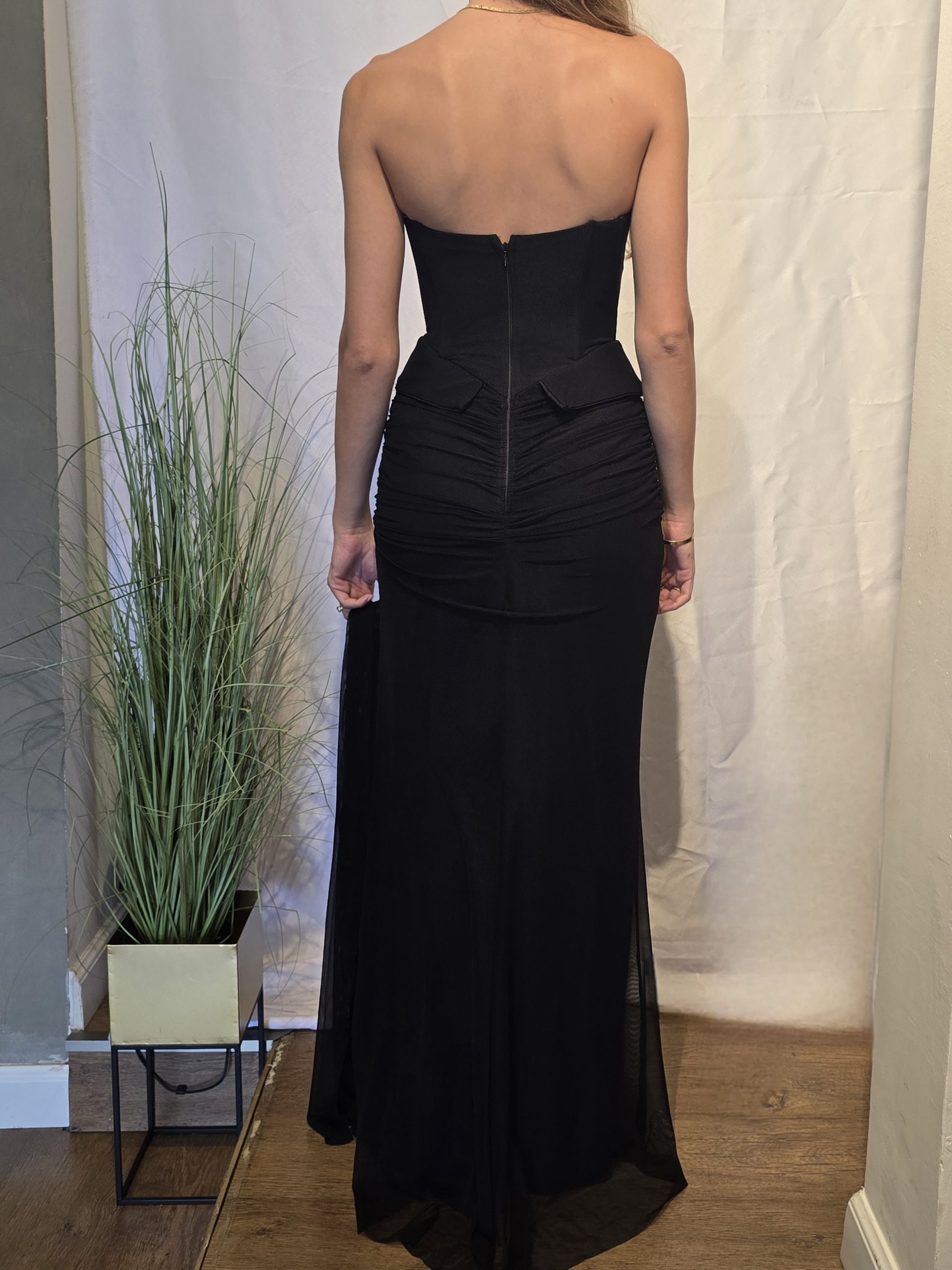 לשמלה חלק עליון בגזרת משולשים ומפתח V וחצאית נשפכת מקו הירכיים. במשחקי שקיפות