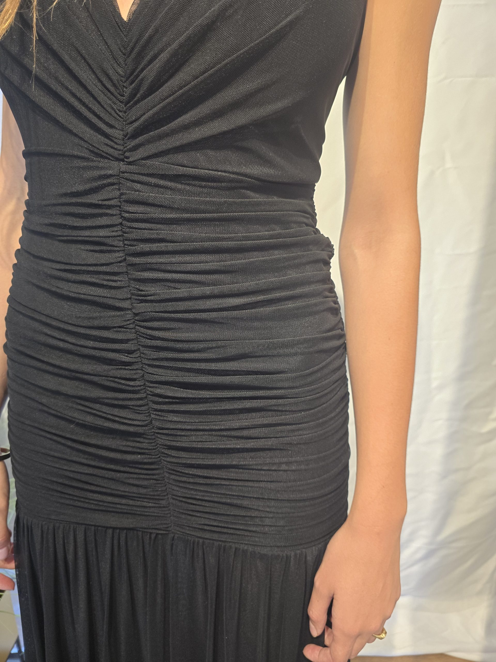 עם כיווצים עדינים לאורכה של השמלה שמדגישים את קווי הגוף.