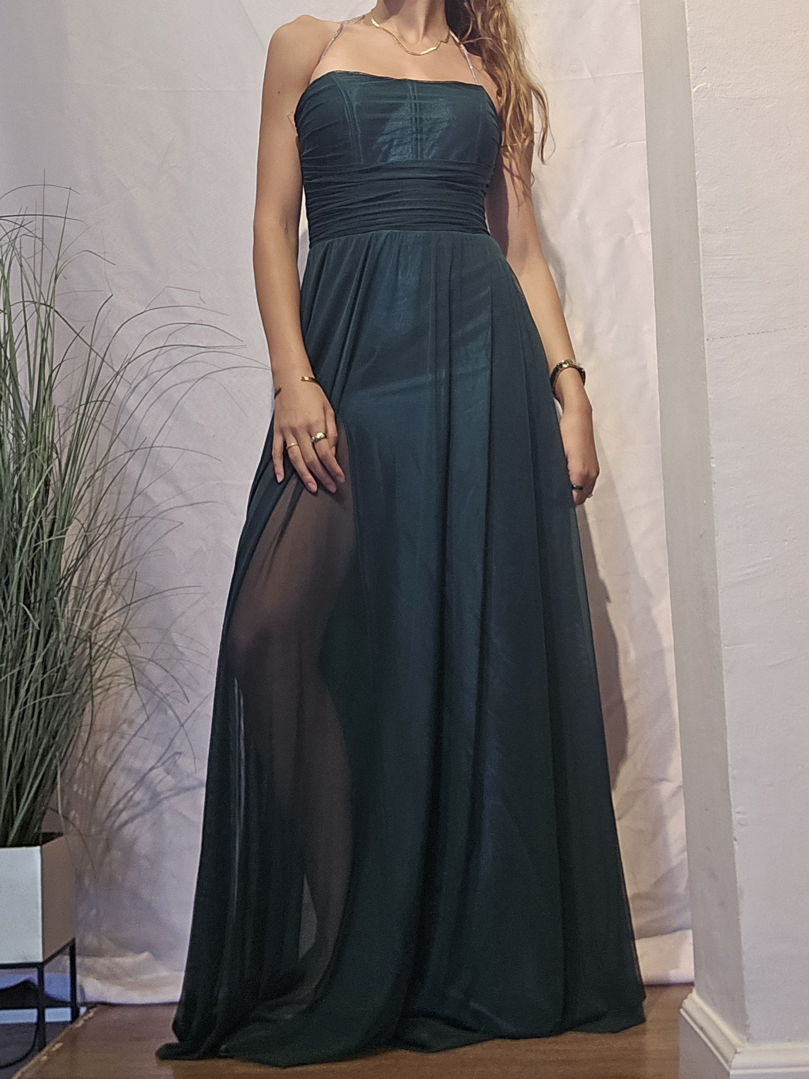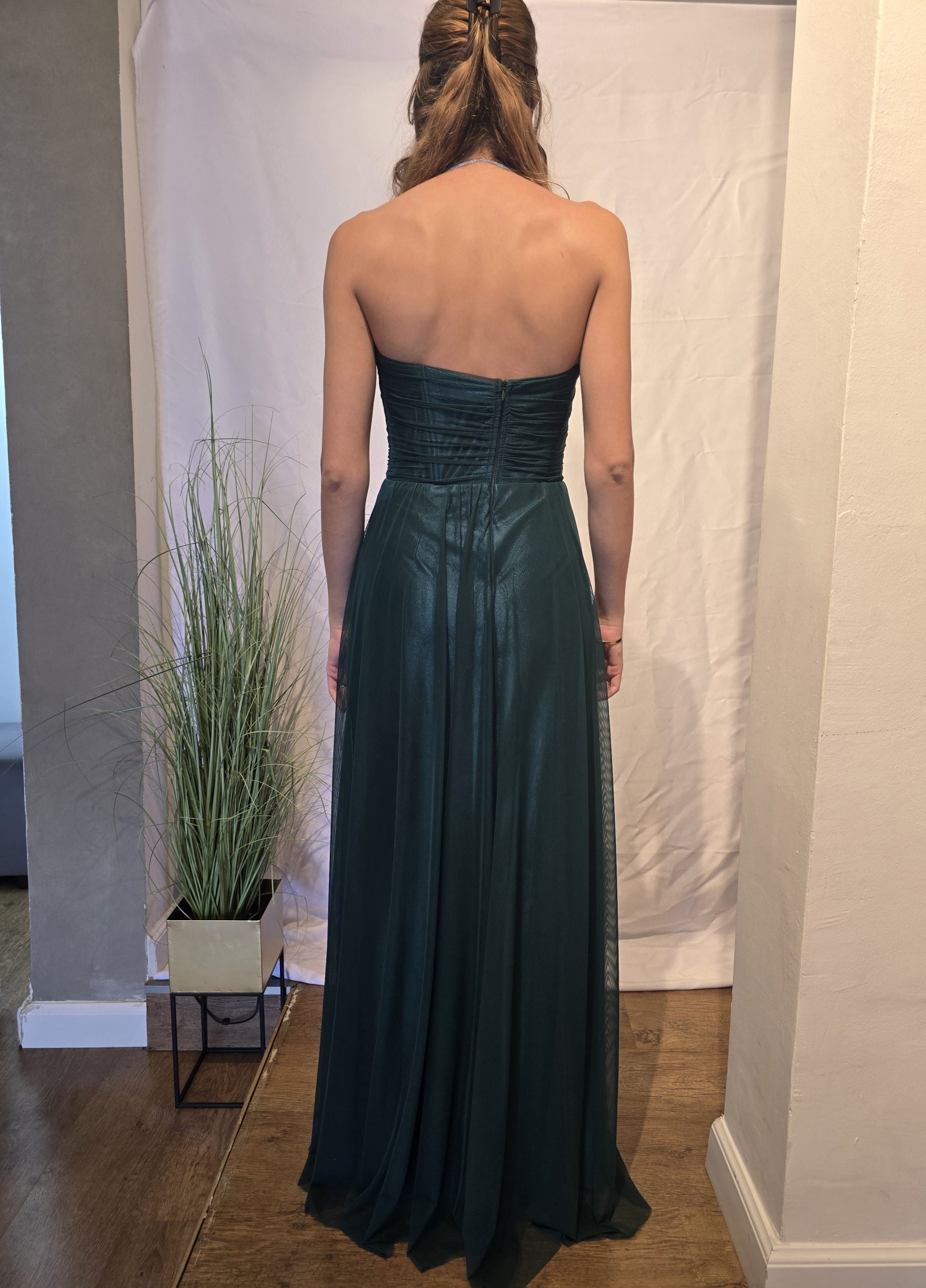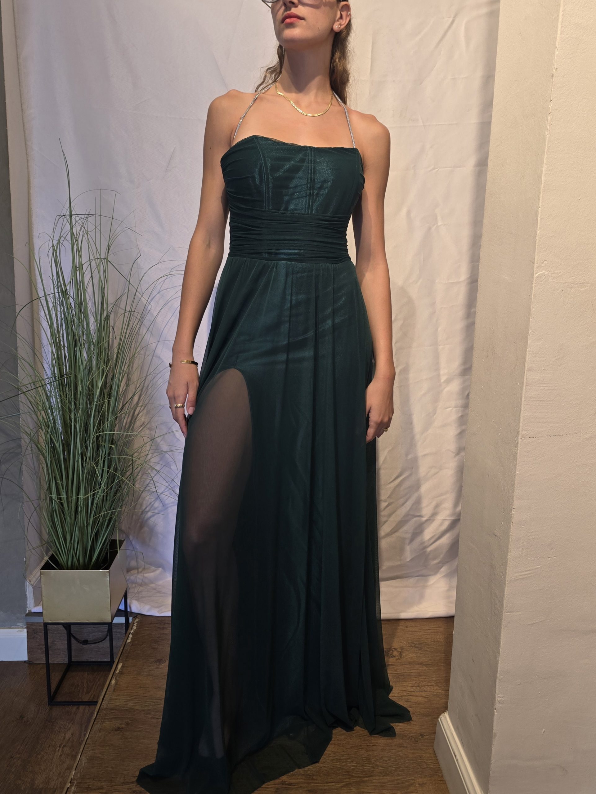 שמלה בסגנון אלגנטי. בצבע ירוק בקבוק בגזרת מכוך אמבטיה.
