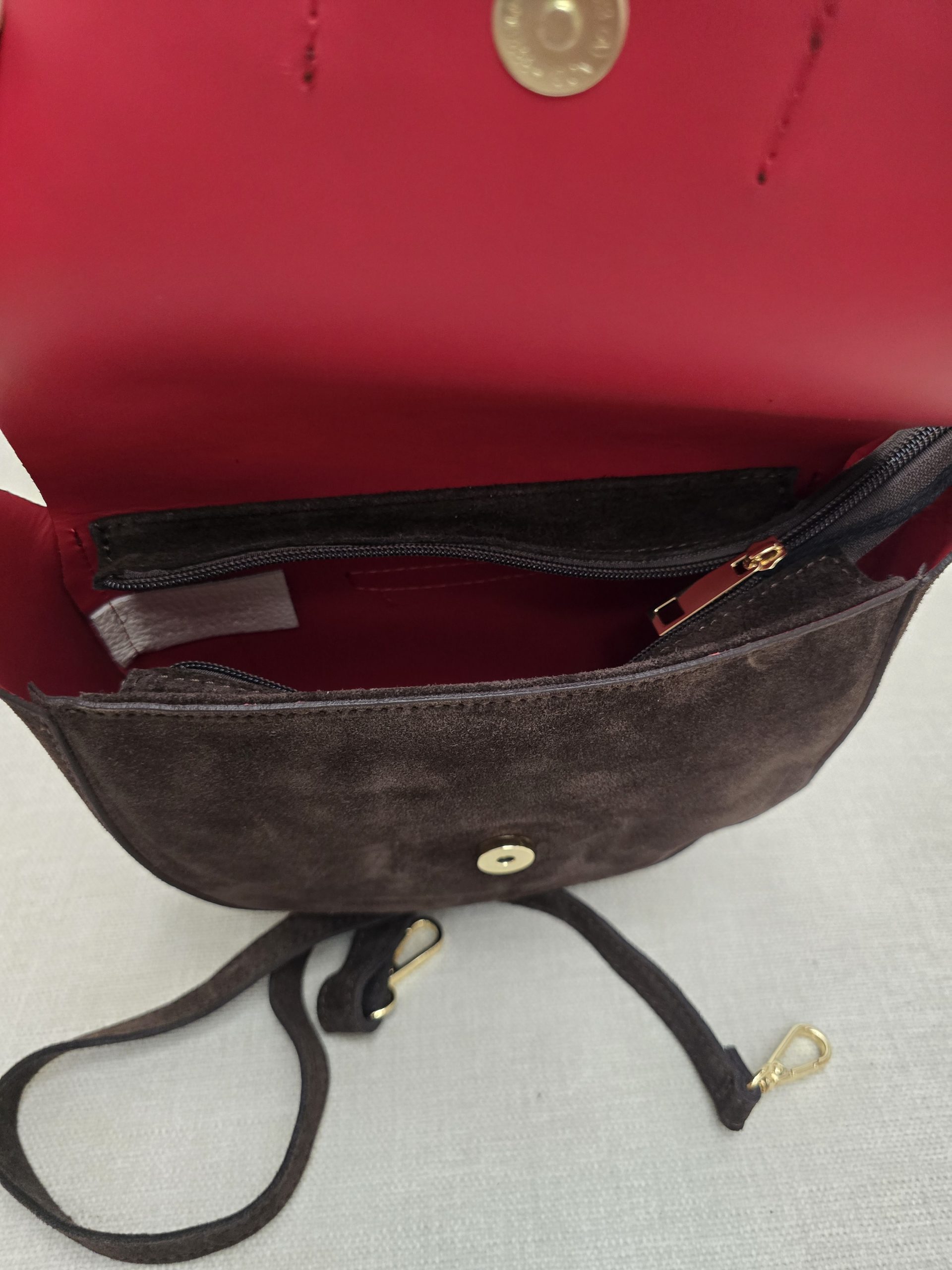 תיק נשים .  עור זמש  בצבע חום . בגזרת תא אחד .. משובץ אבזמי זהב .