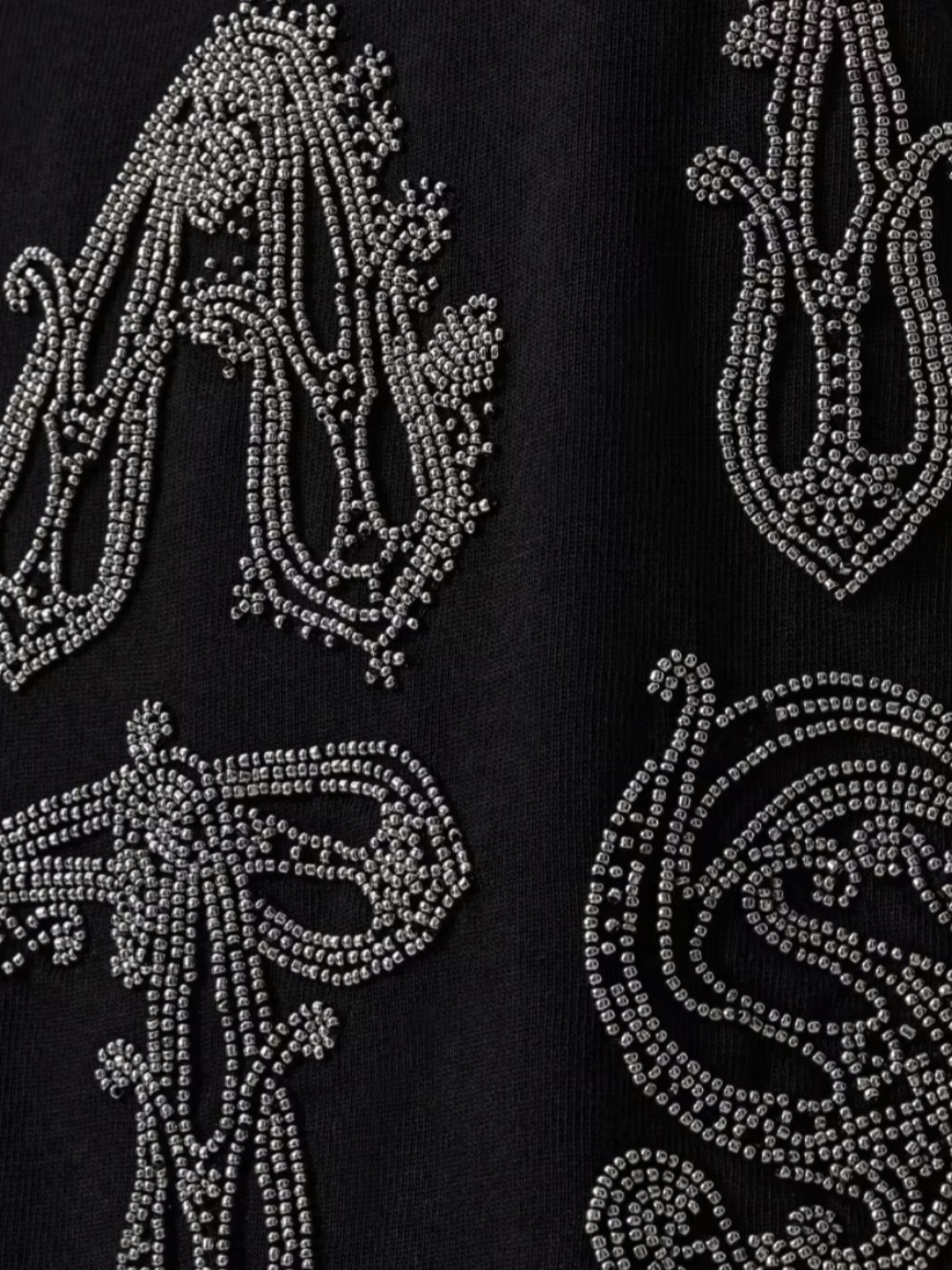 צווארון ניקי . לחולצה רקמת אותיות  מותג פזורות בחזית החולצה מחרוזי כסף .